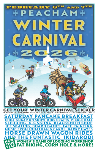 Celebrate the season at the 11th Annual Peacham Winter Carnival! Try a new winter activity, join a guided nature hike, watch a blacksmith demonstration, or get tips at the Women with Chainsaws workshop. Other outdoor activities include horse-drawn wagon rides, cross country skiing, ice skating, fat biking, snowshoeing, snow pile play, and the much anticipated iKIDarod sledding obstacle course. There are indoor activities too such as live music, a puzzle contest, pickleball, face painting and crafts.