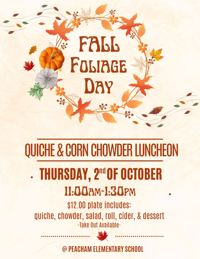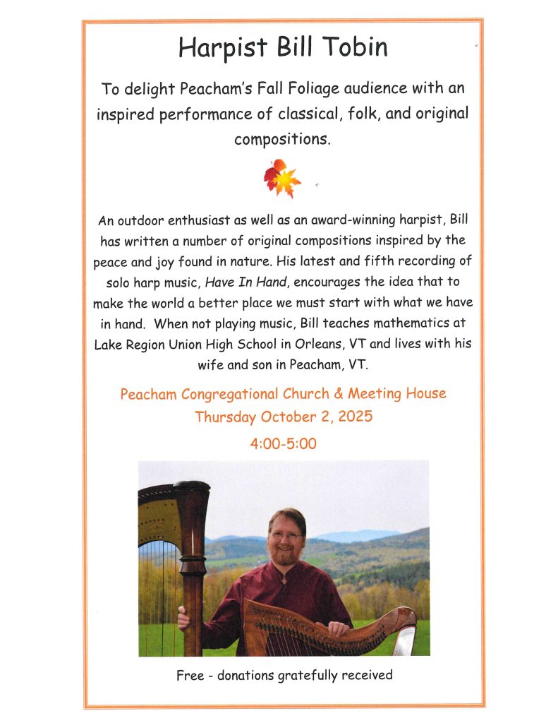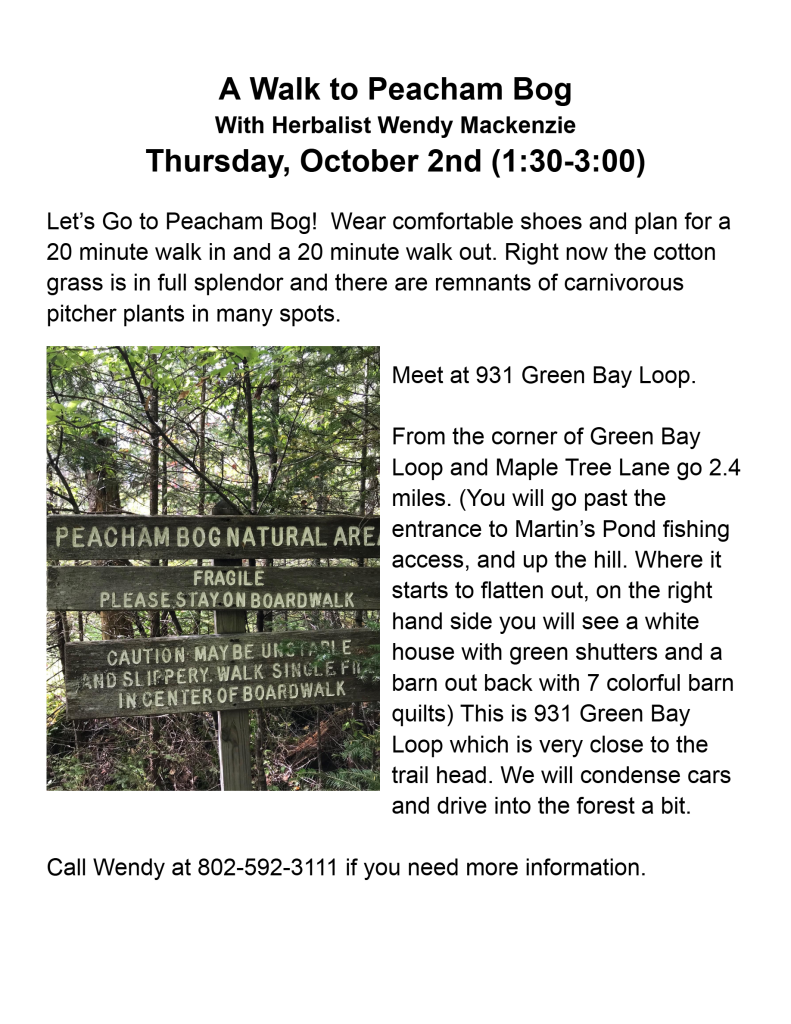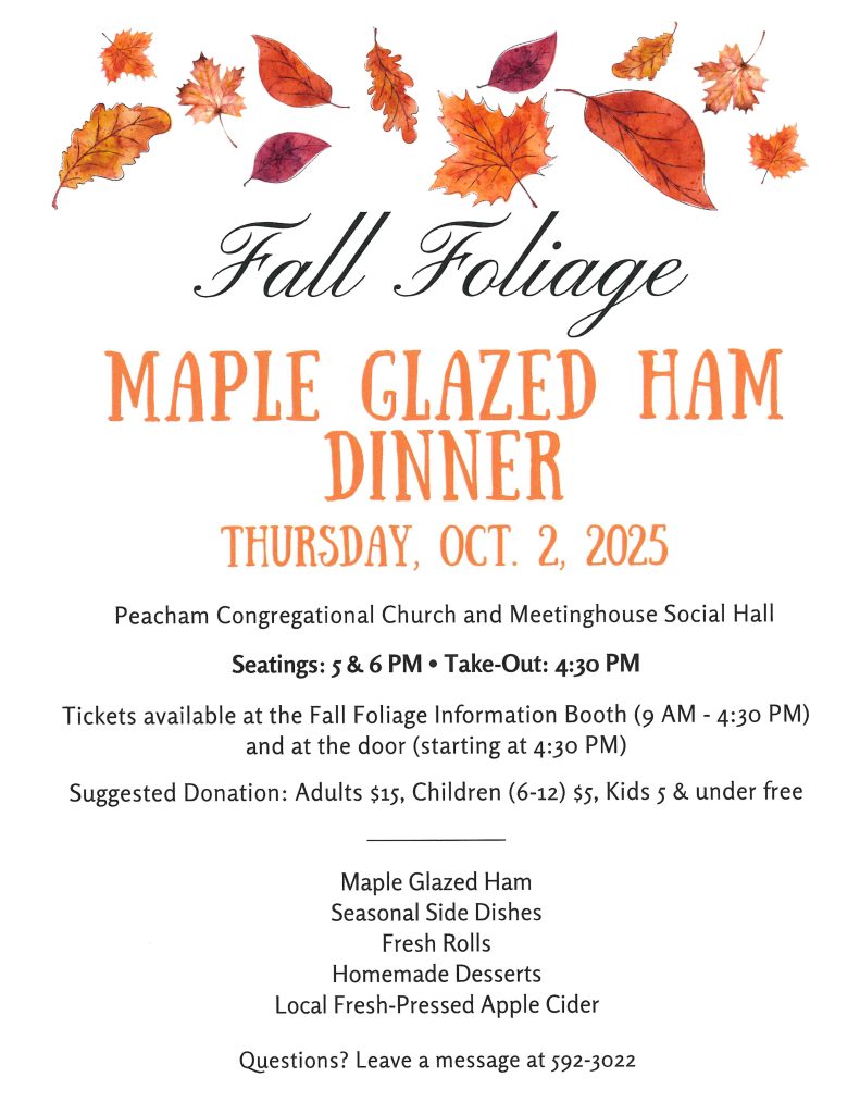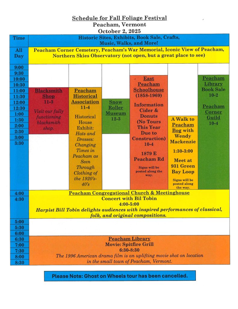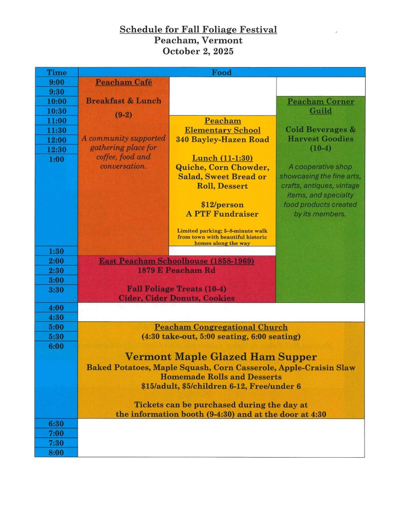 9/30/2025 *PLEASE Note: Updates to the Yellow “Vermont’s Northeast Kingdom” poster for the Peacham section are in the 2 page multi-colored schedule dated 10/2/25 below. The ghost tour is cancelled, observatory will not be able to open for the day, the bog walk is 1:30-3:00 PM, the concert is 4-5 PM, the schoolhouse is not able to do tours but will be available for cider/donuts 10-4, and the church supper is also offering takeout starting at 4:30 PM.