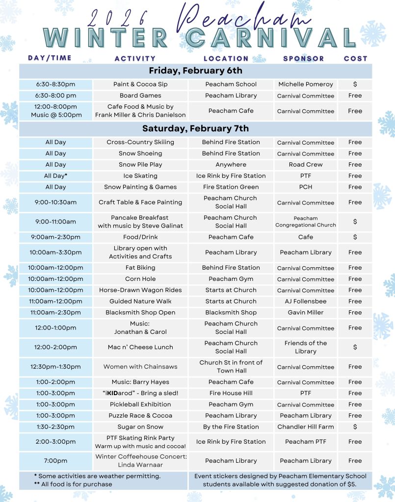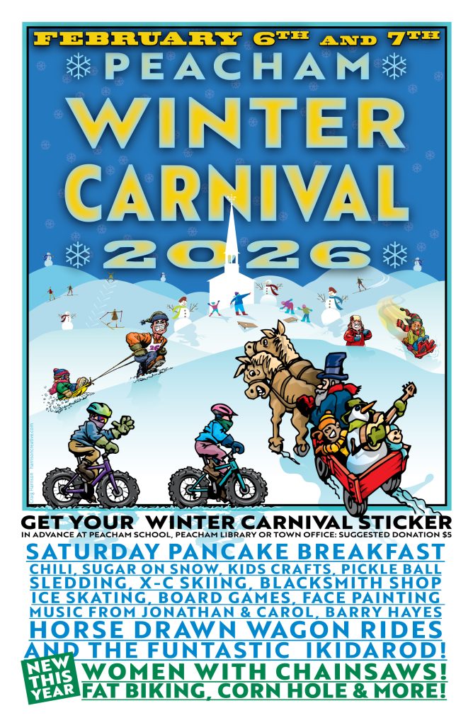 Celebrate the season at the 11th Annual Peacham Winter Carnival! Try a new winter activity, join a guided nature hike, watch a blacksmith demonstration, or get tips at the Women with Chainsaws workshop. Other outdoor activities include horse-drawn wagon rides, cross country skiing, ice skating, fat biking, snowshoeing, snow pile play, and the much anticipated iKIDarod sledding obstacle course. There are indoor activities too such as live music, a puzzle contest, pickleball, face painting and crafts.